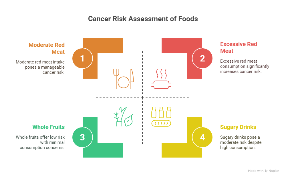 While moderate consumption of red meat is not harmful, excessive intake has been linked to an increased risk of colorectal and other cancers. Cooking red meat at high temperatures (such as grilling or barbecuing) can also produce harmful chemicals that increase cancer risk. Red meat falls under the category of cancer foods to avoid when consumed excessively.