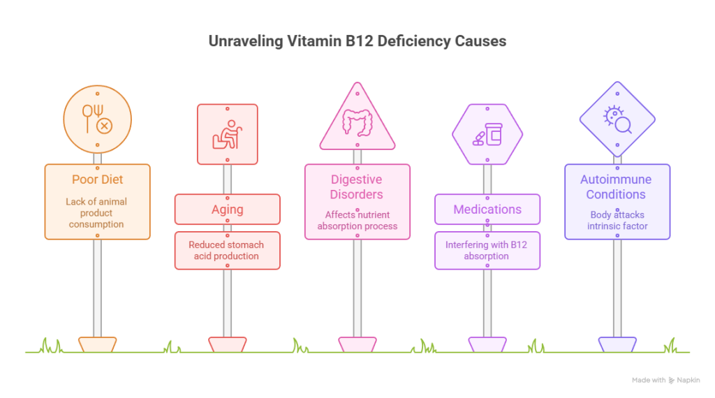- Medications – certain drugs for diabetes or acid reflux can interfere with B12 absorption.